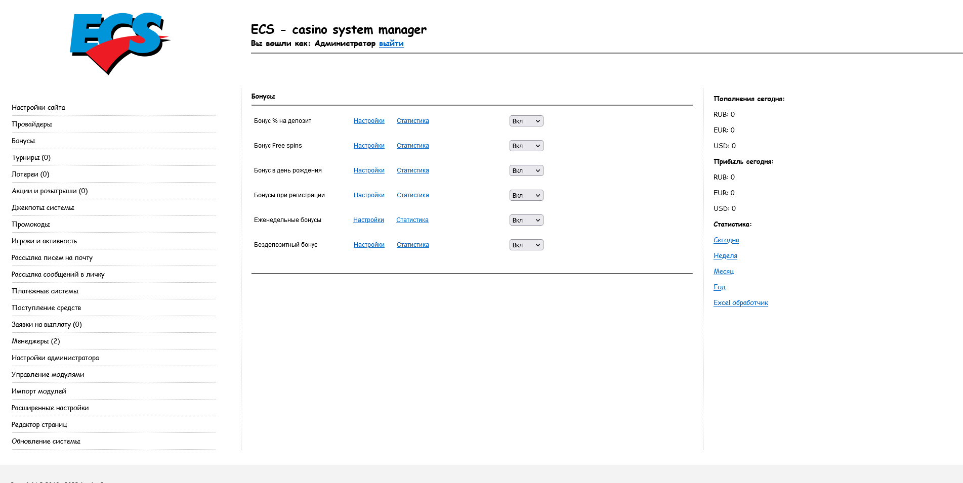 1. Выбор сервера 2. Настройка сервера 3. Установка ядра ECS 4. Настройка ядра ECS 5. Обновление ядра ECS 6. Настройка статистических страниц 7. Настройка провайдеров и слотов 8. Настройка RTP слотов 9. Настройка бонусов 10. Настройка платёжных систем 11. Настройка турниров, лотерей, розыгрышей 12. Настройка модулей 13. Работа с менеджерами 14. Работа с балансами игроков 15. Работа с системой в целом